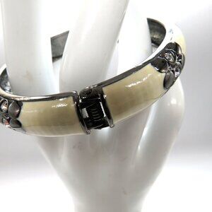Enamel Bracelet Cream Gun Metal Gray Hinged Bangle Clear Rhinestone Accents