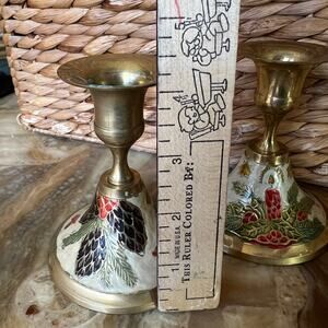A set of three brass candlesticks made in India with enamel designs, including pinecones, mushrooms, and leaves. Overall, in good condition does show some leftover wax. Please refer to all photos for current condition and measurements.