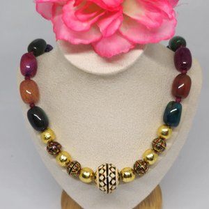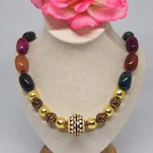 Enamel Cloisonne Crackle Agate Beaded Statement Necklace Gold Green Red Purple
