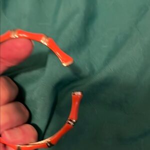 This is a coral color enamel clamper bracelet. It looks like bamboo. It has gold accents. 7.25” . Great summer color! Thank you for looking