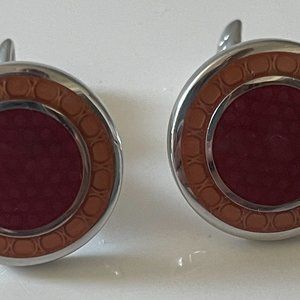 Pair of enamel cufflinks. These are a dark pink/mauve in the center with a lighter pink band on the outside.