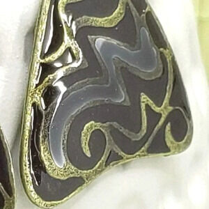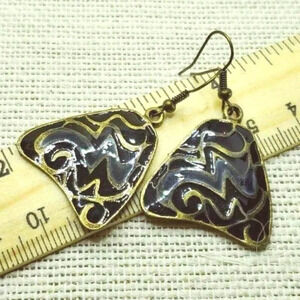 Enamel Earrings Antiqued Brass Gray and Black Triangle