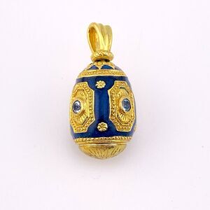 Enamel Easter Egg Pendant Vintage Rich Gold Plate Blue Topaz Crystal Swivel Bail