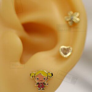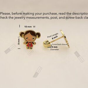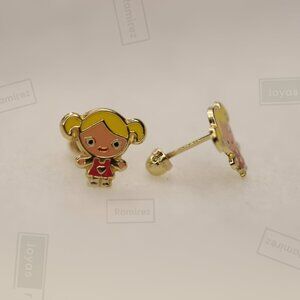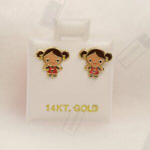 Children’s stud earrings featuring a smiling girl design, crafted in authentic solid 14K gold with vibrant enamel and polished finish.