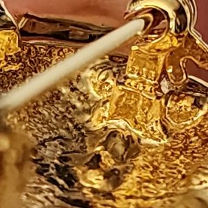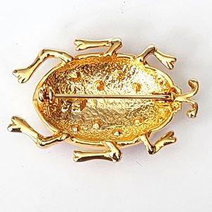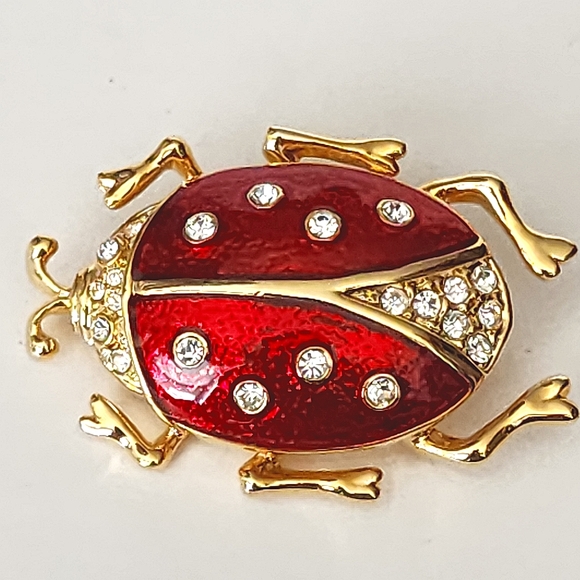 Unbranded goldtone red insect brooch pin. Is it a beetle or a ladybug? You decide! Adorned with red enamel and clear sparkling rhinestones. Rollover clasp closure. Good used condition. Please see photos above for approximate measurements and condition.