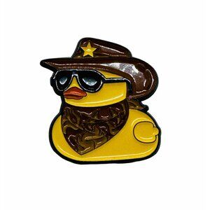 This enamel pin showcases a cowboy rubber duck design, featuring a secure clutch backing. Ideal for adding a playful touch to jackets or backpacks.