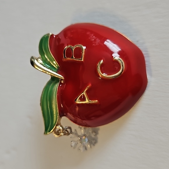 Enamel & Rhinestone ABC Apple on Goldtone Pin. The enamel is in great condition, as is the snowflake bright and shiny.