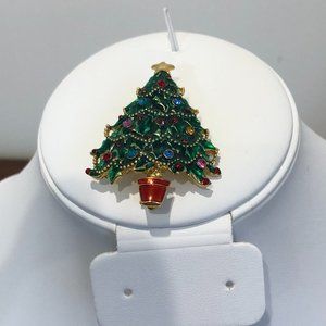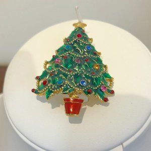 -Enamel and Rhinestone Vintage Christmas Tree Brooch Pin.