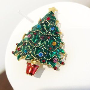 Enamel and Rhinestone Vintage Christmas Tree Brooch Pin.