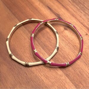 Pink and cream enamel on gold tone metal. Pretty, bamboo style bangles are perfect for adding a pop of color to any outfit!