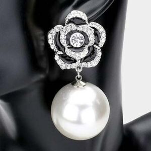 Enamel Black Camellia Flower Pearl Gold Earrings