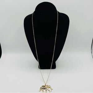 This adorable elephant pendant is in excellent pre-per-owned condition. It's white with colorful flowers and a little mandala on the side. The enamel is set in gold. The chain is approximately 29" and the elephant is about 2" across.