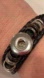 Genuine black leather bracelet with gun metal & polished silver metal beads. Has a large center snap between beads to change the decorative snaps. Includes 1 decorative snap & 2 free glass dome snaps. Has a double snap closure back of wrist to adjust fit. Measures approximately 8” long. Model wrist is 6.75” & on first snap. Unisex for men, women & youth.