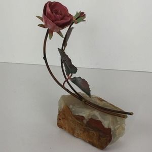 Enameled Copper Metal Rose Flower Sculpture Figurine on Quartz Rock Crystal Base