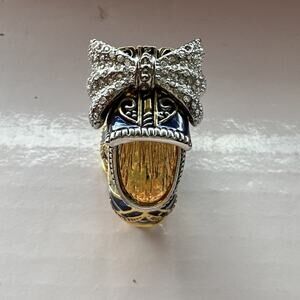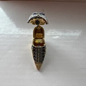 This enameled set of 2 crystal bejeweled cloisonné high heel hinged trinket boxes features a shoe-shaped design in red and blue with a gold tone finish. Made of enamel, metal, and crystal, these small trinket boxes are perfect for all occasions and are easy to care for with a damp cloth. The boxes are adorned with gemstones and have a magnetic closure. Ideal for collectors or those looking to add a touch of elegance to their decor, these trinket boxes are a unique and stylish addition to any room.