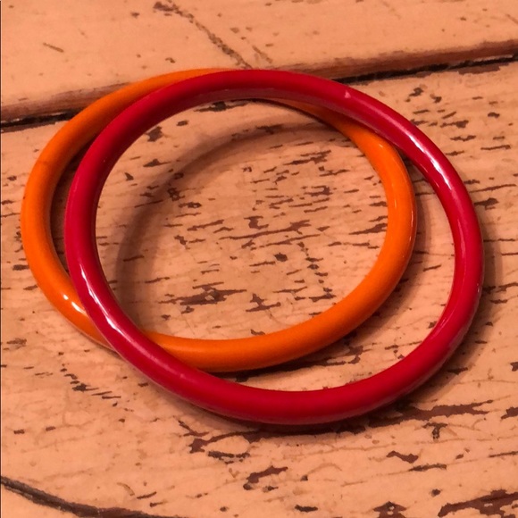 Two vintage enameled bangles in red & orange. Have a nice clinking metal sound when worn together.
