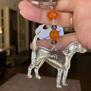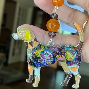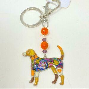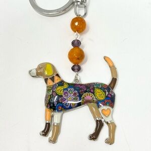 This fun little keychain is made with a metal sculptured beagle dog that is covered in colorful enamel design. I have strung it with fire agate and purple crystal.