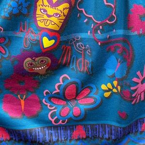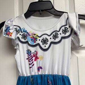 Charming white and blue dress with floral embroidery. Features colorful accents and a playful design. Encanto Inspired Dress- no