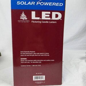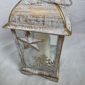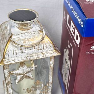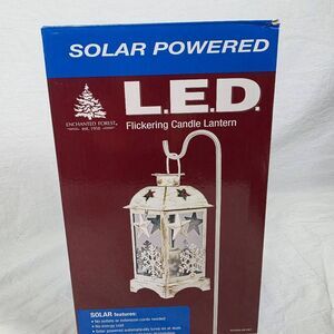 Charming Enchanted Forest solar-powered LED lantern in rustic white. Features cutout stars and snowflakes with a warm flickering candle effect. Includes lantern and metal stake/pole pieces. Perfect for holiday décor, garden paths, or porch displays. Solar panel charges by day and auto-lights at dusk. Pre-owned but clean with minimal wear. Works great and displays beautifully.