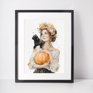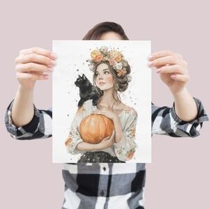 Embrace the magic of fall with this Watercolor Fall Artwork, a captivating blend of autumnal warmth and whimsical artistry. This unframed print features a stunning watercolor illustration of a girl adorned with a vibrant flower crown, cradling a pumpkin and a black cat, evoking the cozy spirit of the season. Perfect for bohemian, rustic, or autumn-inspired interiors, this artwork adds a touch of enchantment to living rooms, bedrooms, nurseries, or cozy nooks. Printed on premium archival-grade paper, it ensures vivid colors and lasting durability. Available in multiple sizes, this print pairs effortlessly with your favorite frame for a personalized look. Bring the serene beauty of autumn into your home with this delightful seasonal portrait!