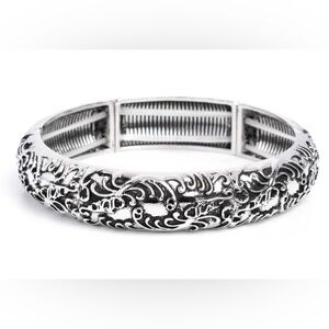 Infused along elastic stretchy bands, curved plates of silver embellished in romantic and curly filigree encircle the wrist for an elegantly enamored look.