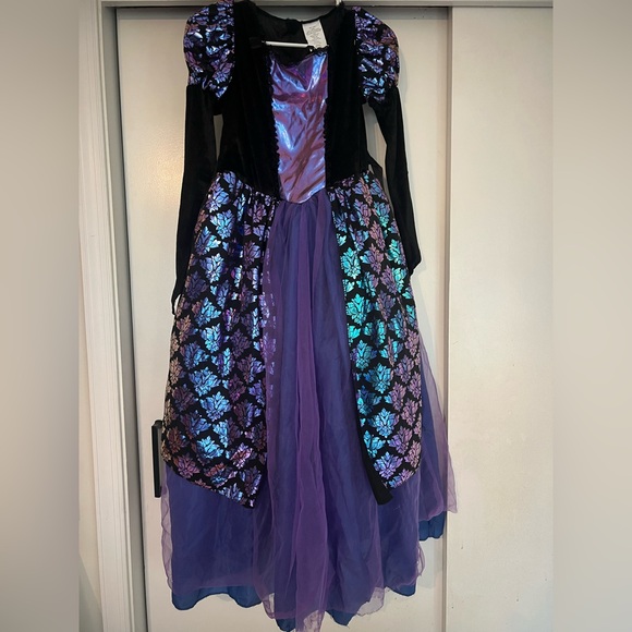 "Descendants." Featuring a luxurious purple velvet bodice adorned with shimmering iridescent sequins and a flowing layered tulle skirt, this costume is perfect for dress-up, parties, or Halloween. The set includes a matching crown and elegant neck collar, completing the enchanting look. Ideal for little ones who want to channel their inner fairy tale character, this costume promises hours of imaginative play. Gently used and in excellent condition-make your little one's dreams come true!