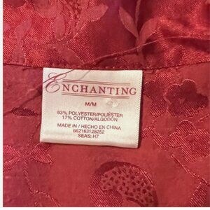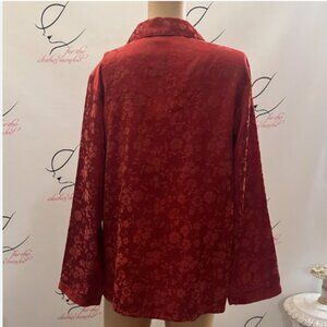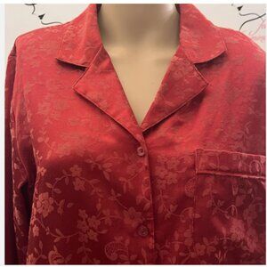 Enchanting. Size Medium. Red PJ Pajama Top. Damask. Cotton Poly. Shoulder to hem 27.2". Sleeve 23.3". Bust 21/42". Pockets. Machine wash.