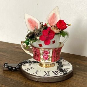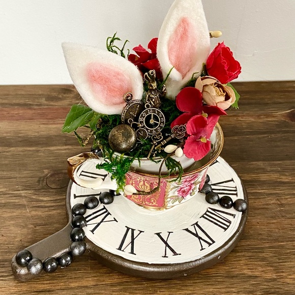 This centerpiece features an adorable white rabbit felt ears nestled among vibrant flowers and greenery. Elegantly arranged in decorative teacups and handmade pocket-watch base, these eye-catching pieces stand approximately 8 inches tall and will serve as delightful conversation starters.