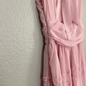 Lulus Enchantingly Sweet Blush Pink Chiffon Backless Maxi Dress! Lightweight woven chiffon shapes this ultra-romantic dress that has a tying mock neckline that tops a blousy bodice with a banded waist and a stunning open back. Skirt has an A-line silhouette and adorable bands of ruffled trim, ending at a maxi hem. Hidden zipper/clasp at side.