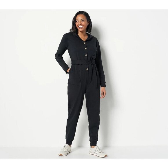 Encore by Idina Menzel Regular Soft French Terry Hooded Jumpsuit Jet Black,3XFabrication: knitFeatures: hood, button-front placket, self tie at waist, front pockets, long sleeves with ribbed cuffFit: semi-fitted; follows the lines of the body with added wearing easeInseam: missy/plus inseam 27"Content: 57% cotton/38% polyester/5% spandexCare: machine wash, line dryImportedBOX 2