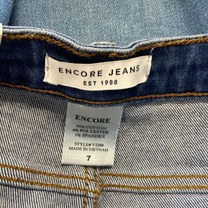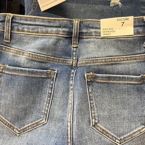 Encore high-rise destroyed skinny jeans size 7the jeans, have straight legs with stretch and high rise. Measurements across the waist 13 inches rise is almost 10 inches inseam 29 inches. These are distressed in the front and the back but because we have various jeans the distress may be different on different jeans