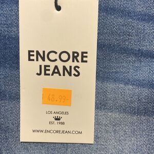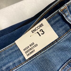 Encore high-rise destroyed skinny jeans size 13 the jeans, have straight legs with stretch and high rise. Measurements across the waist 15 inches rise is almost 12 inches inseam 29 inches. These are distressed in the front and the back but because we have various jeans the distress may be different on different jeans