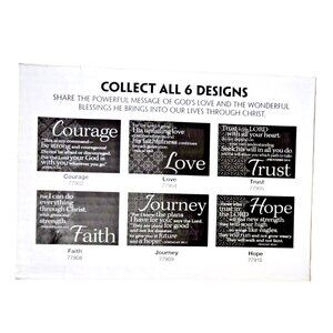 Encouragement Pattern Plaques SET of 6 Courage Faith Hope Journey Love & Trust NEW Share the powerful message of God's love, encouragement & wonderful blessings He brings into our lives through Christ. Each plaque features a subtle tone-on-tone embellishment along the left edge. Pen and post-it-notes NOT INCLUDED, shown only for scale. 5.5" x 3.75" x .25" each NEW IN ORIGINAL PACKAGING