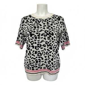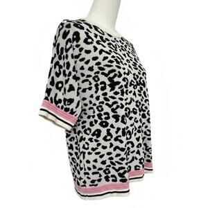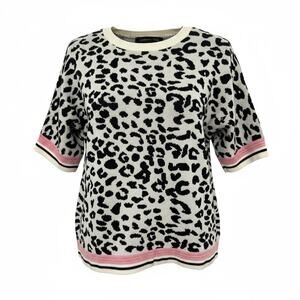 The Endless Rose Anthropologie leopard print short-sleeve sweater in size S/M is a stylish and versatile piece perfect for various occasions. Made from a blend of polyester and acrylic, this lightweight sweater features pink and white stripes on the cuffs and hem, adding a fun pop of color. The tight-knit design and pullover style make it easy to wear throughout the seasons, whether it's for travel, parties, casual outings, formal events, or business meetings. With its unique leopard print theme and all-season appeal, this Anthropologie sweater is a must-have for any fashion-forward woman's wardrobe.