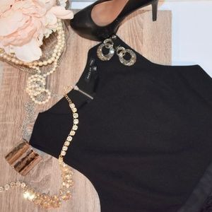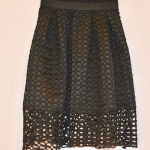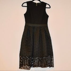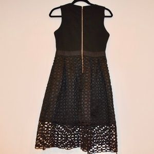 Crew neck, Sleeveless, Pleated lace overlay on skirt, Fully lined, Back zip closure