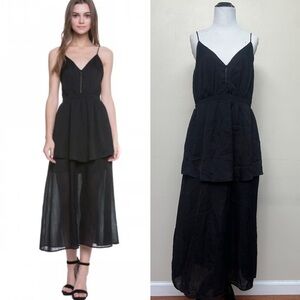 New with tags Endless Rose tiered maxi dress in black. Features spaghetti straps (not adjustable), V-neckline with pleated bodice detail, and a sheer overlay with built-in lining. Elegant tiered design adds flow and movement. Perfect for summer weddings, dinner dates, or vacation nights out.
