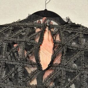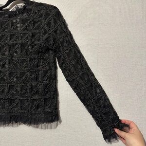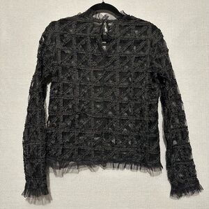 Chic black blouse with intricate textured design. Long sleeves with delicate ruffle cuffs. Perfect for elegant occasions.