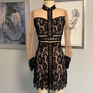 Elegant mini dress with intricate lace design. Sheer long sleeves. Perfect for evening wear.