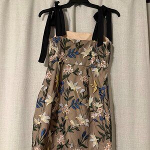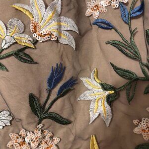 Beautifully detailed tan mesh mini dress featuring vibrant floral embroidery and black tie shoulder straps. Fully lined with a fitted silhouette and zip-back closure. Perfect for weddings, brunches, or garden parties.