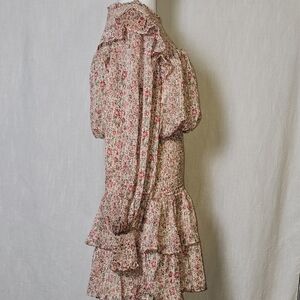 This Endless Rose dress in size M features a beautiful combination of floral and striped patterns on a chiffon fabric, with a high neck and long sleeves. The dress has a zip closure and is adorned with ruffle and layered accents, giving it a unique and stylish look. Perfect for occasions like weddings, parties, or casual outings, this mini dress is designed with a smocked detail and is ideal for the spring and summer seasons. The multicolor design and flower theme add a touch of femininity to the outfit.