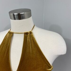 Size XS. In amazing condition. Metallic like mustard colored material. Cutout detail across the front. Criss cross straps across the back. zipper also on the back. Raw hem across the bottom. Shell Material is a mix of polyester and spandex. Polyester lining. Bust is about 14 inches across. About 40 inches long from the shoulders down.