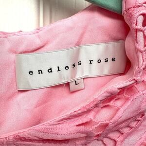 This pink sequin and lace mini dress from Endless Rose appears brand new. The sheath is floral lace and lined. There is a sprinkling of sequins for just a touch of shimmer. The stock photos are paler pink than the actual dress. It is a rich candy pink. The sleeveless dress is size large.