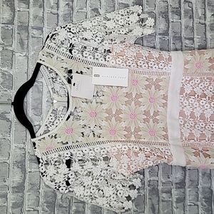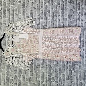 Chic lace mini dress. Features floral patterns. Short sleeves. Perfect for any occasion.