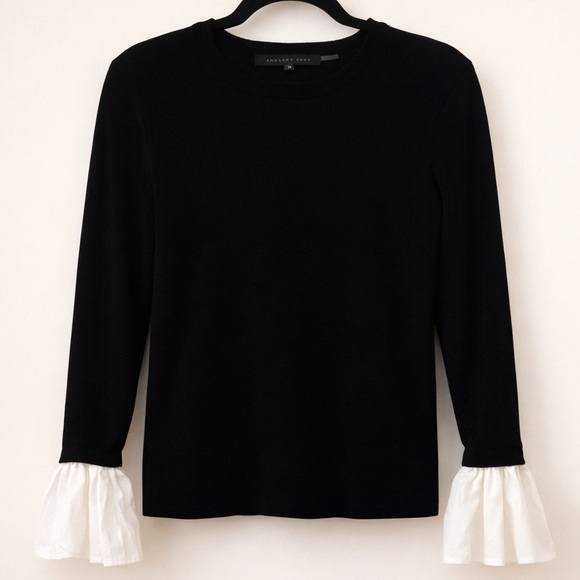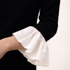 Chic and polished Endless Rose black knit top featuring feminine white ruffle cuffs for a modern contrast detail.