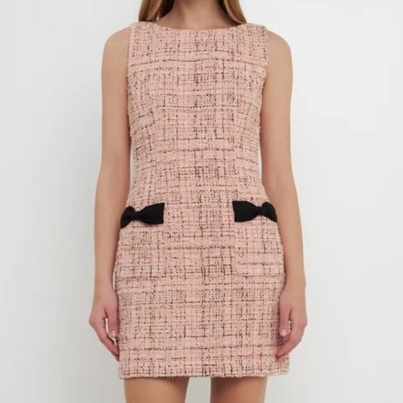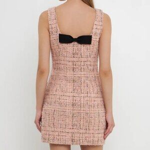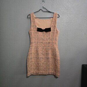 Tweed mini dress with functional front pockets. Black bows on pockets and on the back. Like new only one or two small imperfections on the back. Zipper on the left side.