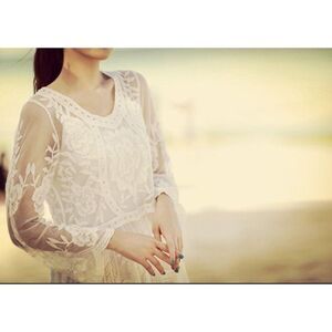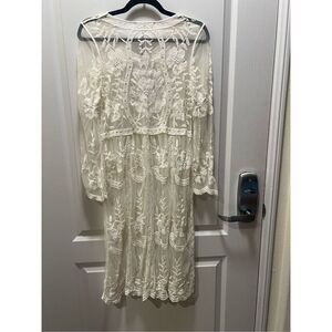 Endless Rose Women Sheer Embroider Lace Bohemian Shift Dress in White Size S Gorgeous white lace adorns this flowy dress. Expertly designed, this dress features a sheer lace body, long sleeves, a v-neck, and scalloped trim. Stretch design throughout for the best fit. Gorgeous worn over a tank dress for a boho vibe
