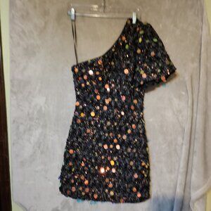 Once upon a time, in a world where sparkle reigned supreme, a dazzling dress was born. This one-shoulder mini, adorned with a cascade of sequins, promises to captivate any room. Its asymmetrical design and shimmering allure make it a masterpiece of elegance, perfect for those magical evenings where stars align.