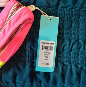 Stylish two-piece bikini in neon pink, neon yellow and white with front zipper details. Bright design for standout pool and beach days. Comfortable, supportive fit with adjustable straps and secure zip accents. small bottoms and medium top.