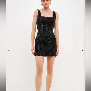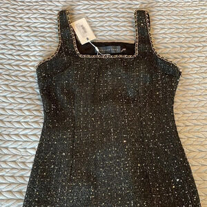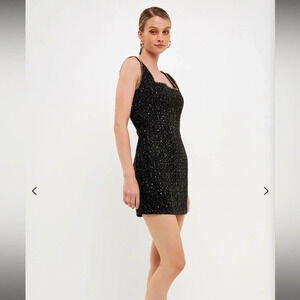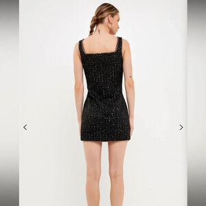This sequin tweed mini dress is accented with a chain trim, which is made from a high-quality faux leather strip and gold chain.