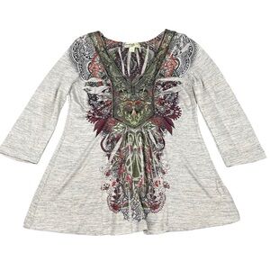 Energe by OneWorld Shirt Womens Small Beige Grey Heather Embroidered Print Multi